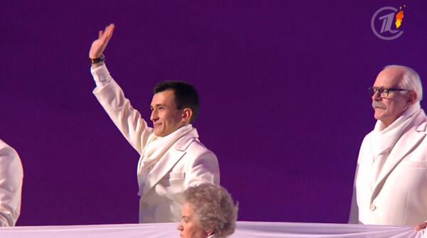 22:32 Чулпан Хаматова, Анастасия Попова (это журналистка, если что), Валентина Терешкова, Вячеслав Фетисов, Валерий Георгиев, Лидия Скобликова, Никита Михалков и некий киберспортсмен несут флаг.